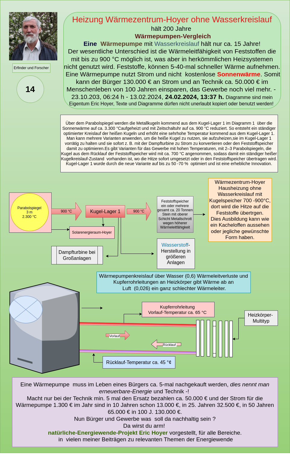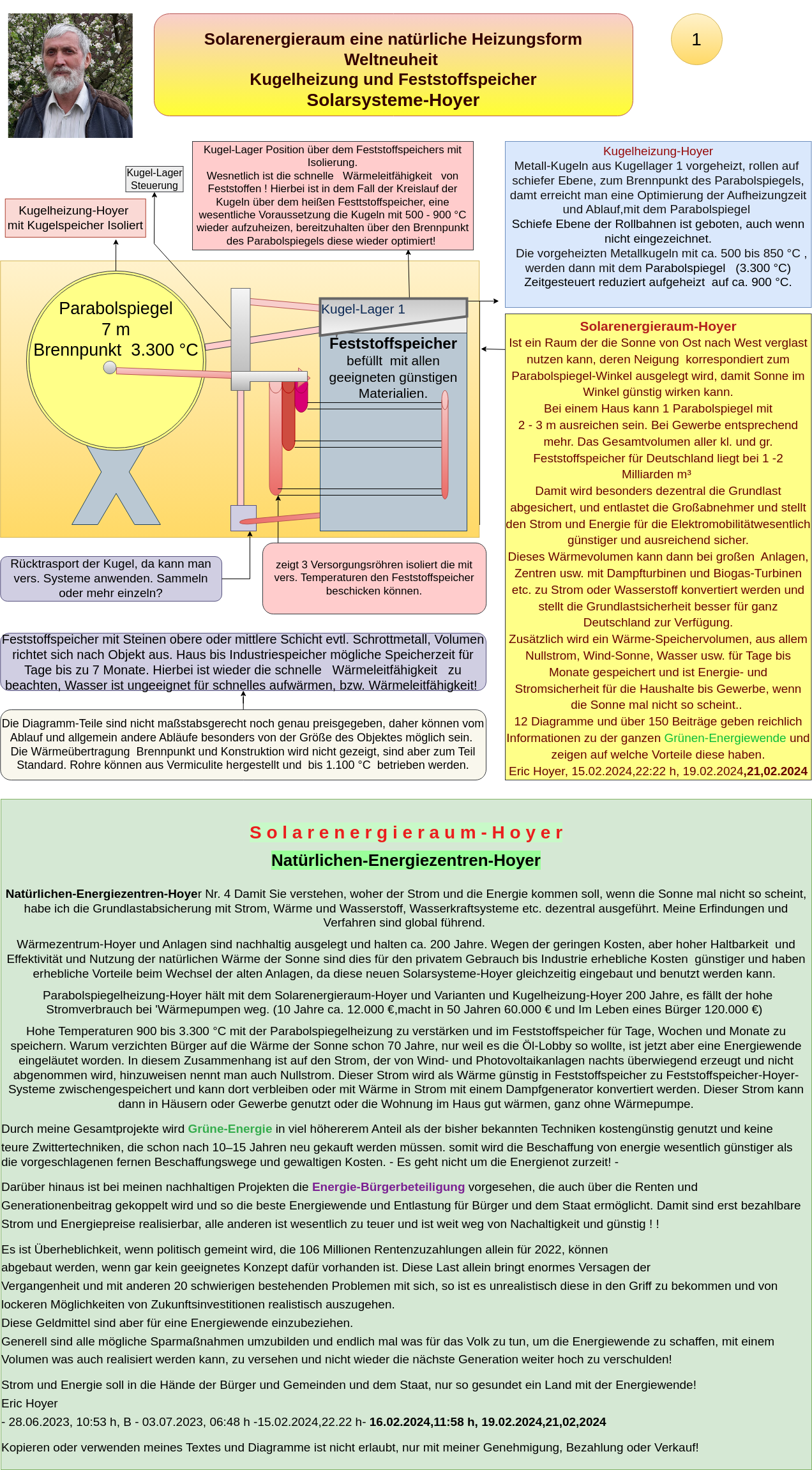 Danke. Ja, es sind Vergleiche zu ziehen, die den Nullstrom als Mindestangabe darstellen, damit der Betrachter schon mal eine Vorstellung erhält, was bisher an Strom nicht wirtschaftlich gespeichert werden kann. Die andere Sache ist auch interessant der Einbau an Feststoffen, die geeignet sind aus der Müllverwertung, die besonders in Kühltürmen und den Feststoffspeichern der natürlichen-Energiezentren-Hoyer eingelagert werden können. Diese Variante ist besonders interessant, weil dann Steine etc. nicht in einem Steinbruch gebrochen werden muss. Es geht einmal um das Volumen der Speicherung von Wärme und Strom und auf der anderen Seite um Müllverwertung in ewigen Feststoffspeichern. Es geht auch um das Volumen der Atommüll-Abfälle von vorerst von 300.000 Tonnen, die im Wechsel mit neutralem Material in den 17 AKWs , wie aufgezeigt, gespeichert werden können. Eric Hoyer, 30.08.2024.