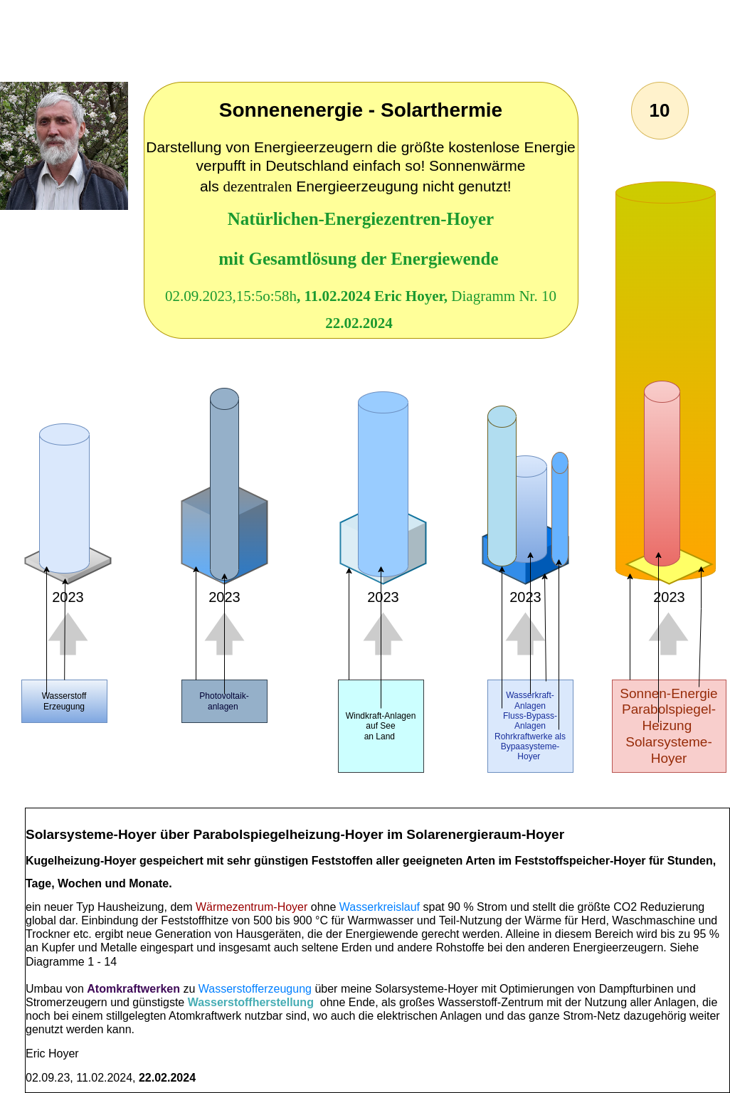 Danke. Ja, es sind Vergleiche zu ziehen, die den Nullstrom als Mindestangabe darstellen, damit der Betrachter schon mal eine Vorstellung erhält, was bisher an Strom nicht wirtschaftlich gespeichert werden kann. Die andere Sache ist auch interessant der Einbau an Feststoffen, die geeignet sind aus der Müllverwertung, die besonders in Kühltürmen und den Feststoffspeichern der natürlichen-Energiezentren-Hoyer eingelagert werden können. Diese Variante ist besonders interessant, weil dann Steine etc. nicht in einem Steinbruch gebrochen werden muss. Es geht einmal um das Volumen der Speicherung von Wärme und Strom und auf der anderen Seite um Müllverwertung in ewigen Feststoffspeichern. Es geht auch um das Volumen der Atommüll-Abfälle von vorerst von 300.000 Tonnen, die im Wechsel mit neutralem Material in den 17 AKWs , wie aufgezeigt, gespeichert werden können. Eric Hoyer, 30.08.2024.